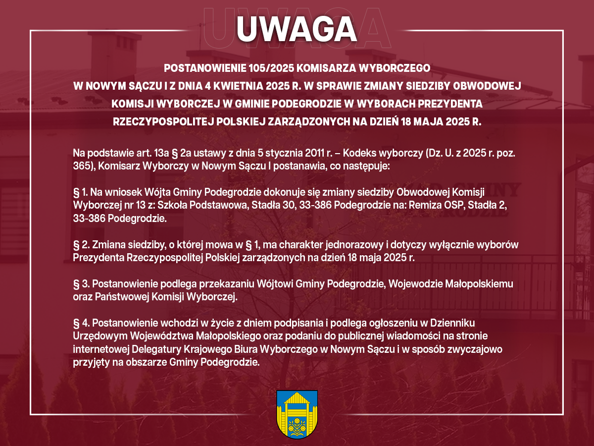POSTANOWIENIE 105/2025 KOMISARZA WYBORCZEGO W NOWYM SĄCZU I z dnia 4 kwietnia 2025 r. w sprawie zmiany siedziby obwodowej komisji wyborczej w Gminie Podegrodzie w wyborach Prezydenta Rzeczypospolitej Polskiej zarządzonych na dzień 18 maja 2025 r.