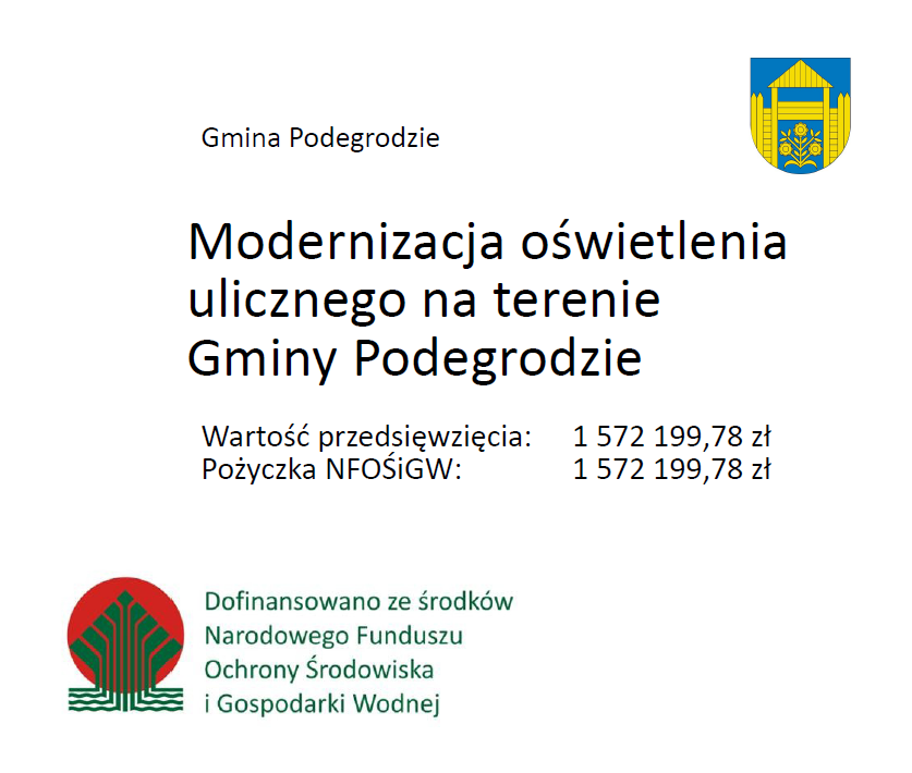 Podegrodzie, w ramach której wymieniono stare energochłonne oprawy na nowe oprawy LED o łącznej mocy nieprzekraczającej 37,56 kW. Zrealizowane prace obejmowały wymianę opraw oświetleniowych w ilości 947 szt. (w tym: wymiana 656 szt. i dowieszenie: 291 szt.).