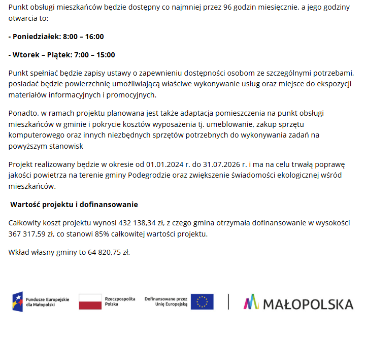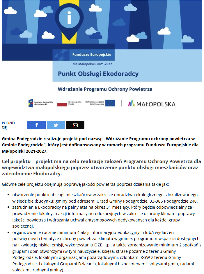 Przypominamy, iż Gmina Podegrodzie w dalszym ciągu realizuje projekt pod nazwą „Wdrażanie Programu ochrony powietrza w Gminie Podegrodzie”, który jest dofinansowany w ramach programu Fundusze Europejskie dla Małopolski 2021-2027