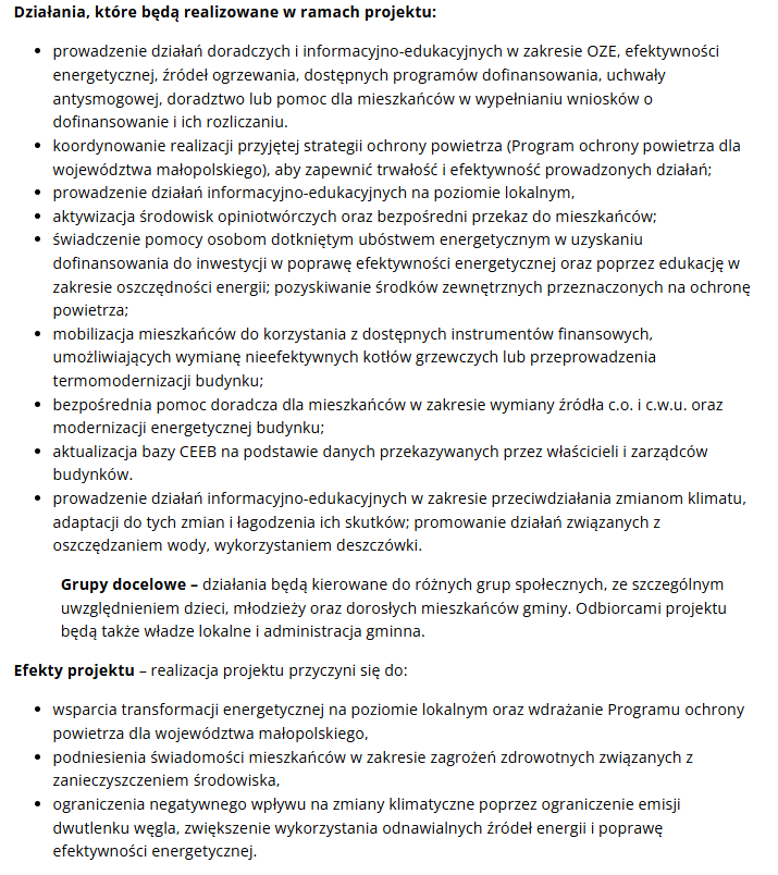 Projekt ma na celu realizację założeń Programu Ochrony Powietrza dla województwa małopolskiego poprzez: