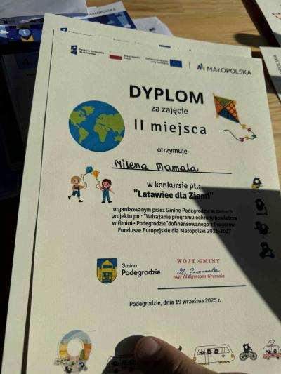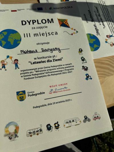 Główne nagrody w konkursie „Latawiec dla Ziemi” zostały ufundowane w ramach projektu „Wdrażanie czystego powietrza w Gminie Podegrodzie”, realizowanego z Funduszy Europejskich dla Małopolski 2021 – 2027.