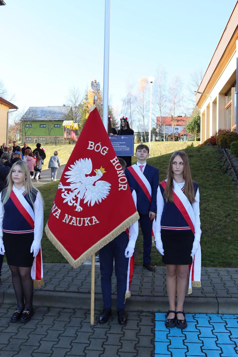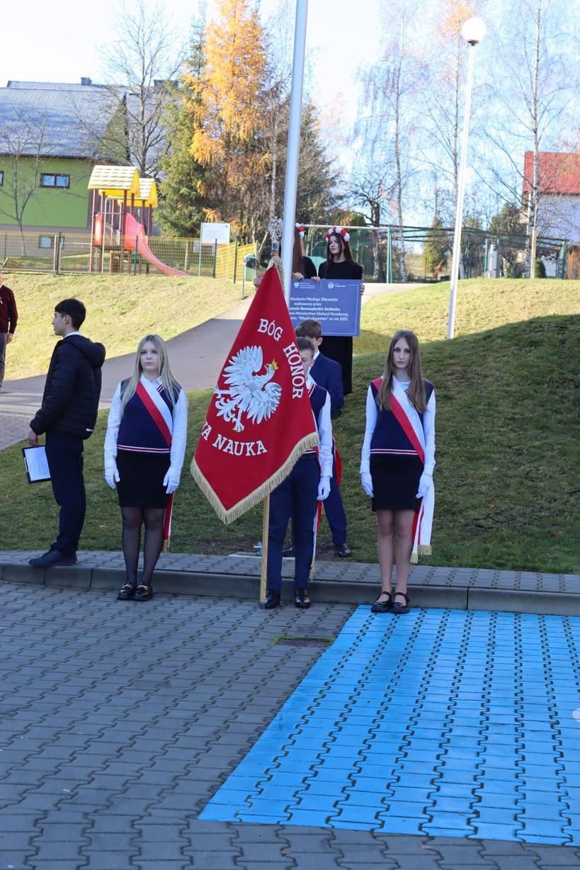 Uroczystość rozpoczęła się o godzinie 10:00 na placu przed szkołą, gdzie zgromadzili się uczniowie, nauczyciele oraz zaproszeni goście. Na początku odbyła się ceremonia wciągnięcia flagi państwowej na maszt, połączona z uroczystym odśpiewaniem hymnu narodowego – „Mazurka Dąbrowskiego”. Maszt zakupiony, z programu „Mały Obywatel”.