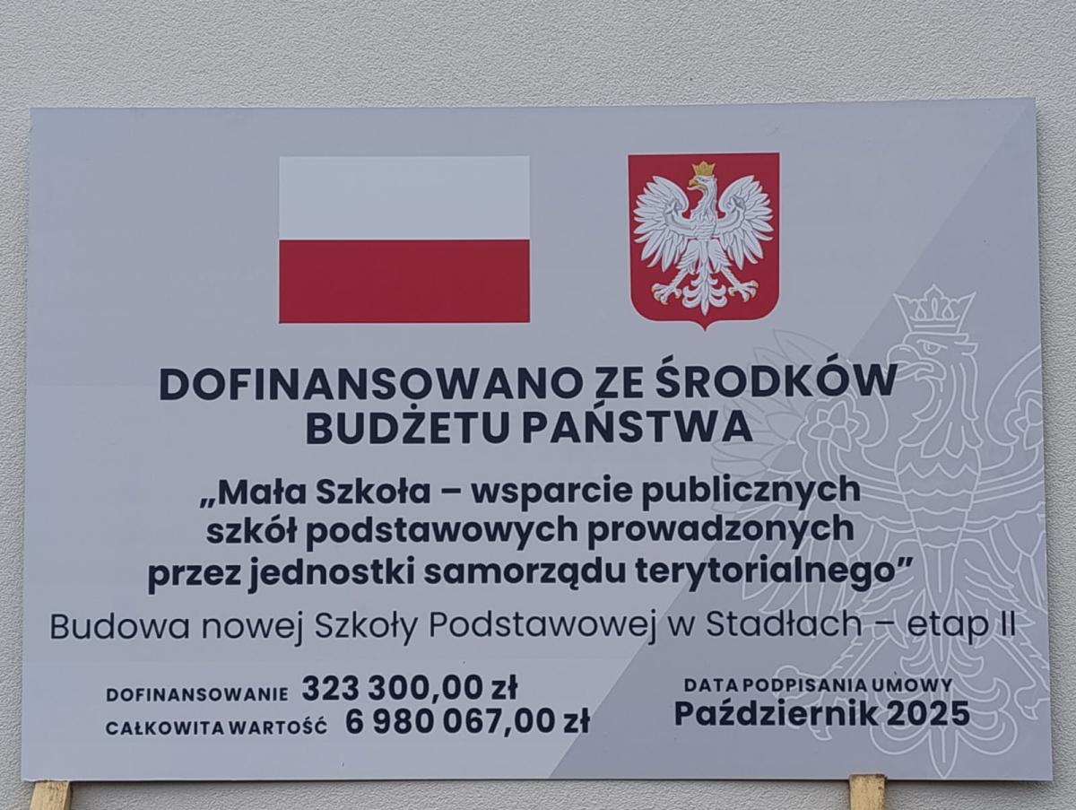 Zadanie publiczne pn. „Budowa nowej Szkoły Podstawowej w Stadłach - etap II” dofinansowano ze środków Ministerstwa Edukacji Narodowej zgodnie z zawartą umową nr MEN/2025/DFS/1329 z dnia 31.10.2025 r.
