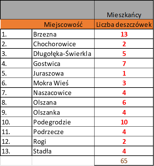 Wnioski będą realizowane zgodnie z kolejnością ich złożenia/wpływu, do wyczerpania puli zakupionych zbiorników do magazynowania wód deszczowych i roztopowych. Dodatkowo pod uwagę będzie brana ustalona ilość deszczówek przewidziana dla poszczególnych miejscowości. W przypadku niewykorzystania limitu w danej miejscowości wolna pula przechodzi na listę rezerwową, obejmującą kolejne wnioski według kolejności wpływu.