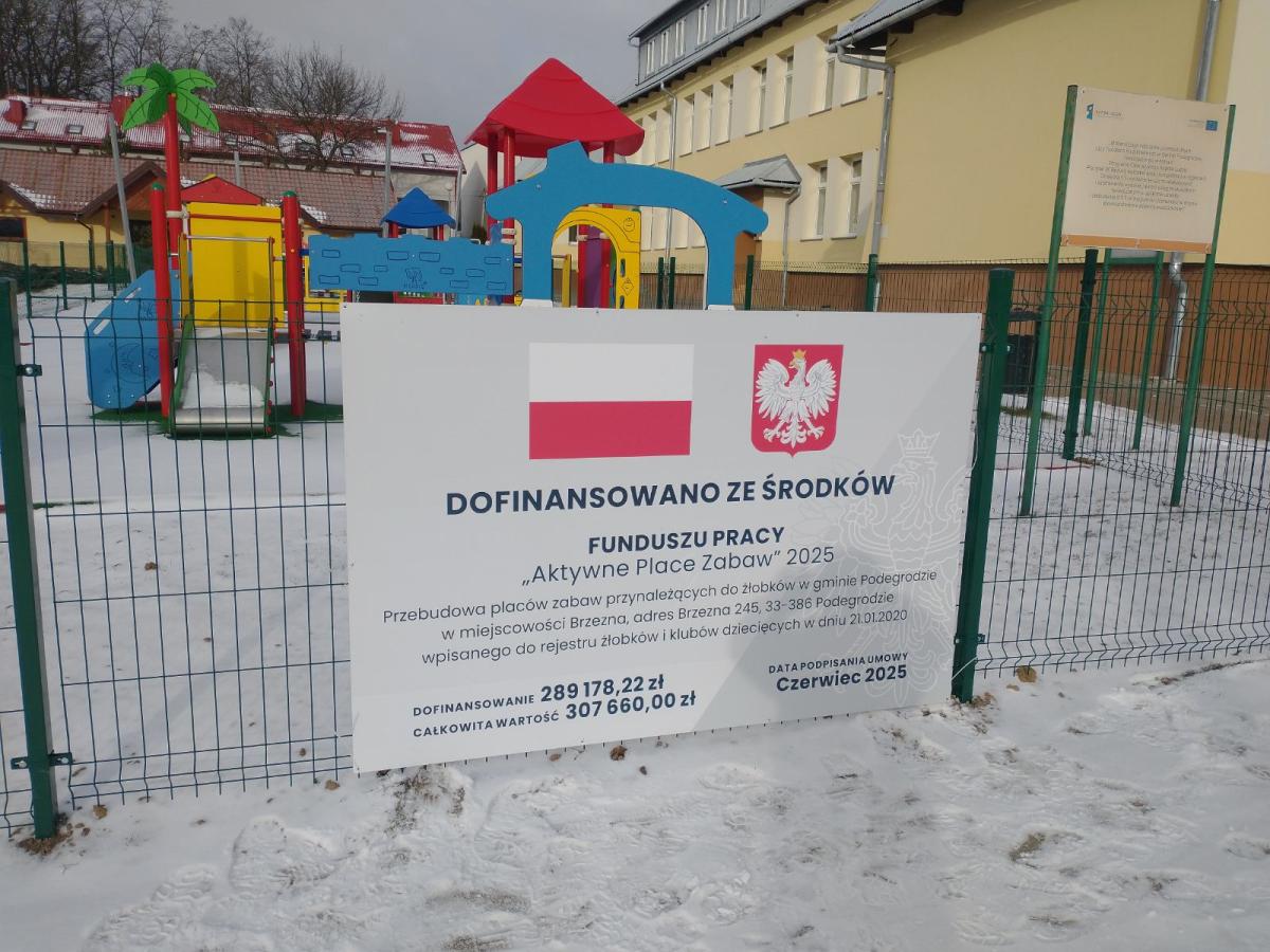 Gmina Podegrodzie zakończyła realizację inwestycji pn. Przebudowa placów zabaw przynależących do żłobków w gminie Podegrodzie, zlokalizowanej w miejscowości Brzezna, Brzezna 245, 33-386 Podegrodzie, przy żłobku wpisanym do rejestru żłobków i klubów dziecięcych w dniu 21.01.2020 r.”