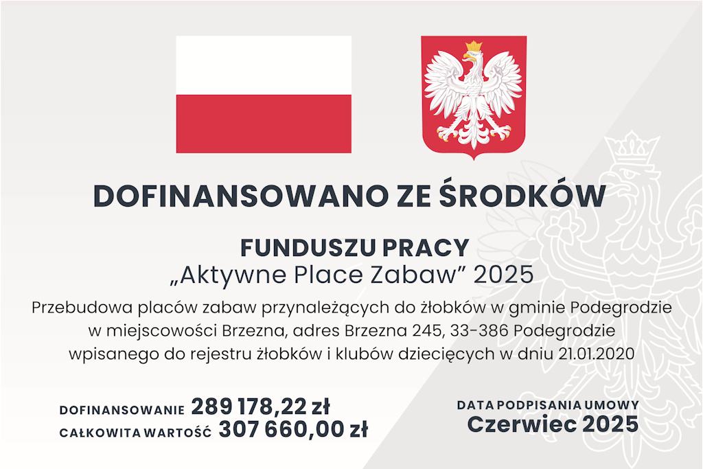 Zadanie zostało zrealizowane w ramach Programu Aktywne Place Zabaw 2025, finansowanego z Funduszu Pracy jako dotacja celowa z budżetu państwa.