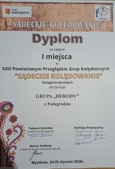 Z ogromną radością informujemy o wspaniałych osiągnięciach naszych grup kolędniczych, które z dumą reprezentowały Gminę Podegrodzie podczas Powiatowego Przeglądu Grup Kolędniczych w Mystkowie.