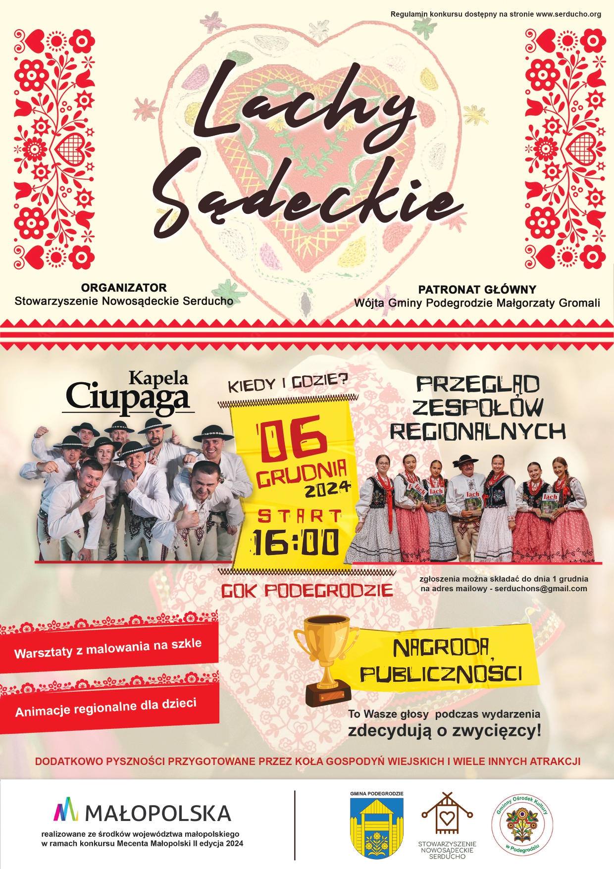 Stowarzyszenie Nowosądeckie Serducho, Gminny Ośrodek Kultury w Podegrodziu oraz Urząd Gminy Podegrodzie zapraszają na wyjątkowe wydarzenie kulturalne "Lachy Sądeckie", które odbędzie się w Gok w Podegrodziu. To inicjatywa skierowana do mieszkańców Sądecczyzny i całej Małopolski, mająca na celu promocję i ochronę dziedzictwa kulturowego regionu Lachów Sądeckich.